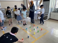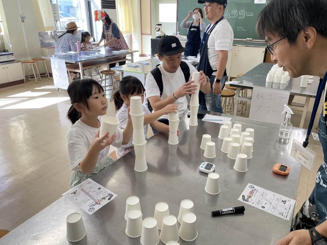 輪なげ、豆つかみ、紙コップタワーで、個数を競って。